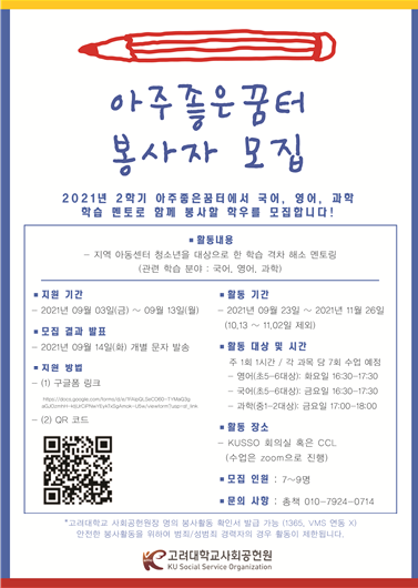 < 2021학년도 2학기 고려대학교 사회공헌원 아주좋은꿈터 봉사활동 참가자 모집 >