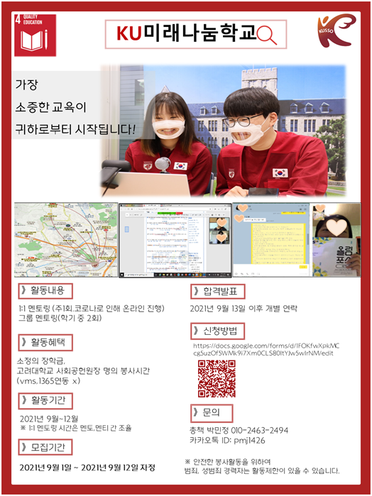 [공지사항][KUSSO] 2021학년도 2학기 KU미래나눔학교 봉사활동 참가자 모집