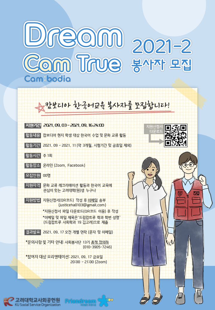*문의: 고려대학교 사회봉사단 13기 Dream Cam True 총책 정의하(010-3905-7246), 사회공헌지원부 이송(02-3290-5056)