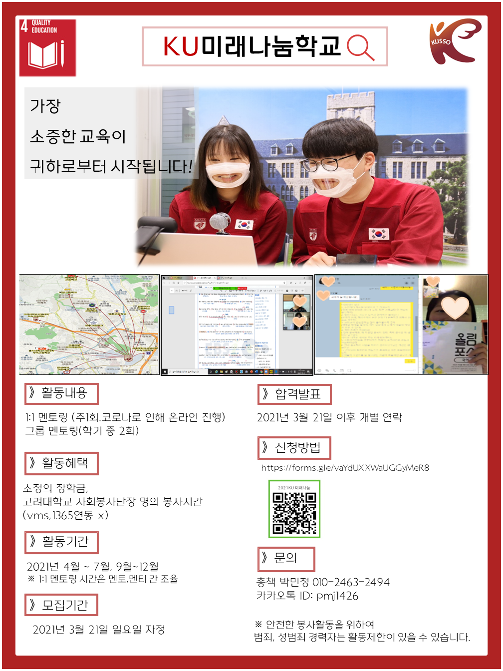 [공지사항][KUSSO]2021학년도 KU미래나눔학교 봉사활동 참가자 모집