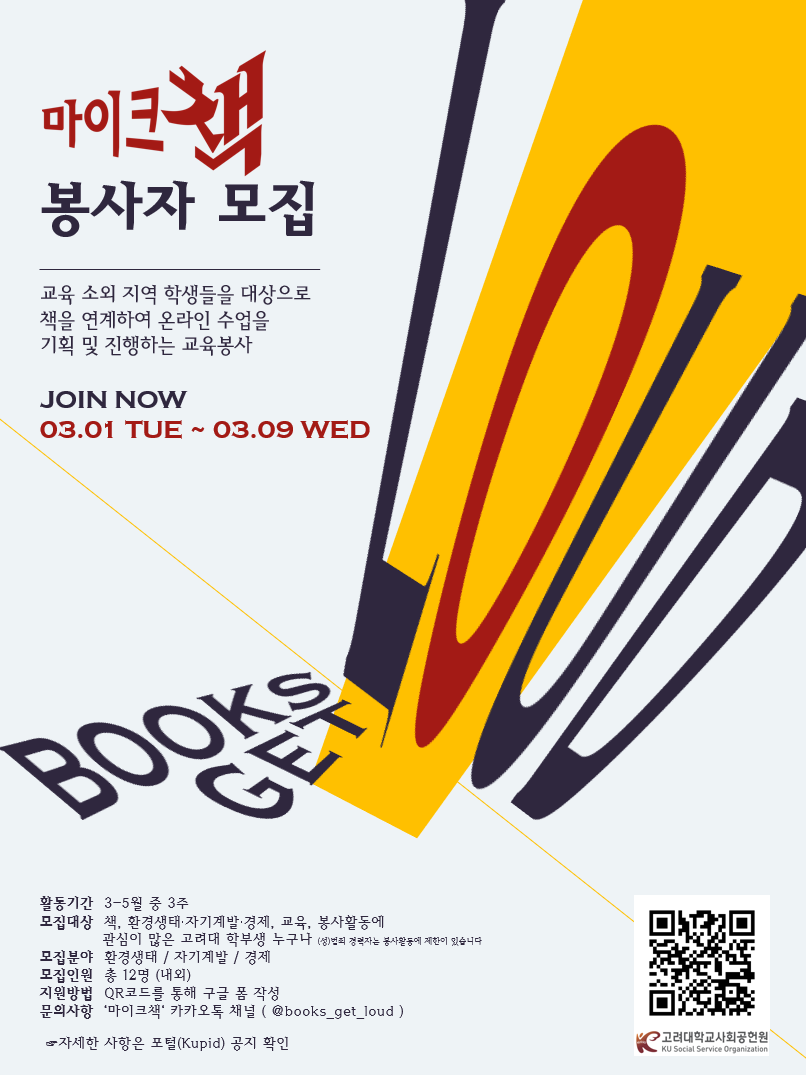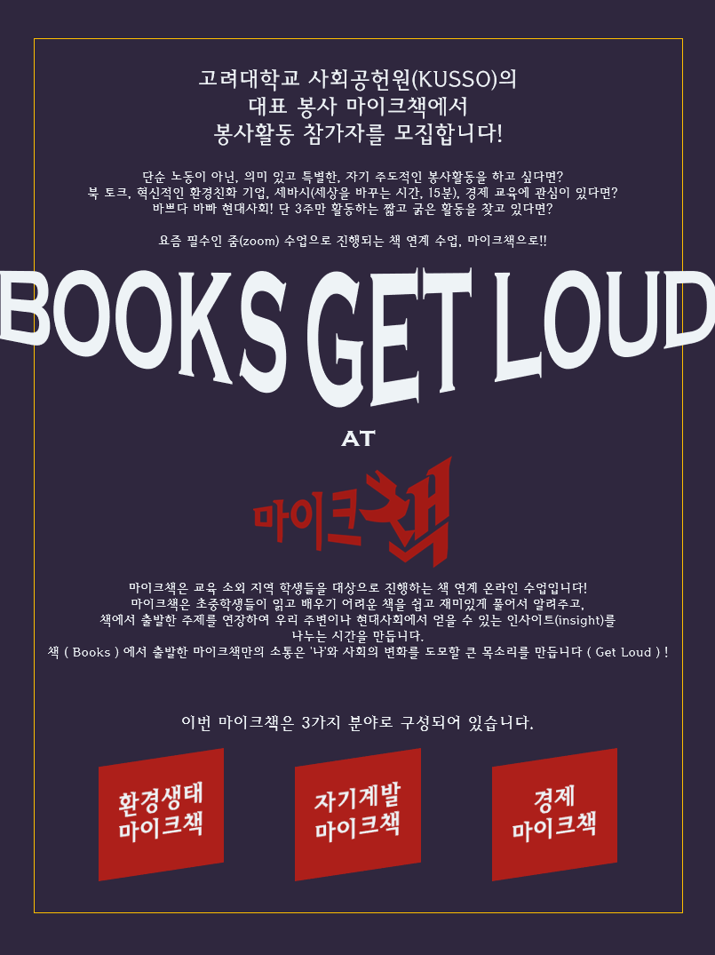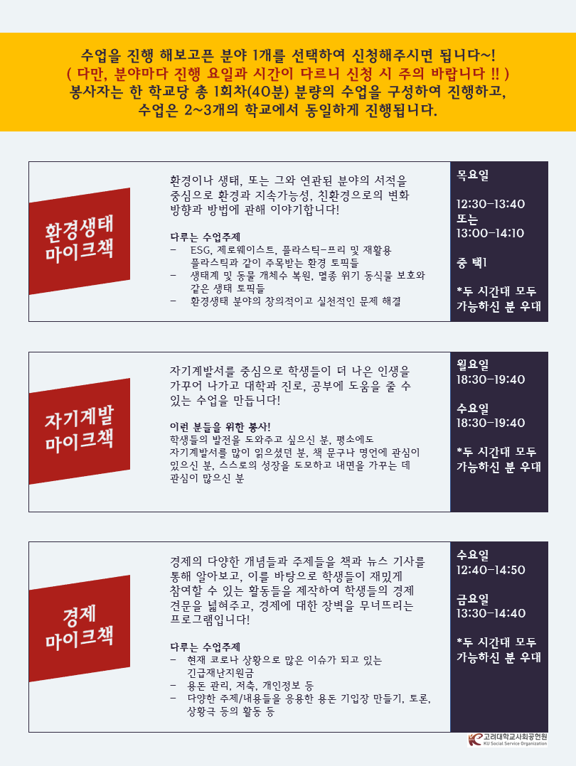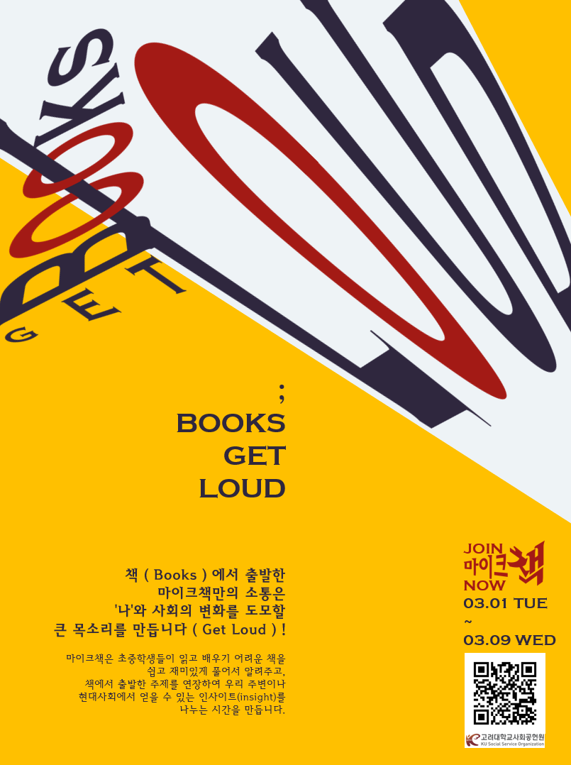 고려대학교 사회공헌원(KUSSO)의 대표 봉사 [ 마이크책 ]에서 봉사활동 참가자를 모집합니다!